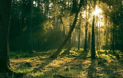 Atmospheric forest during golden hour