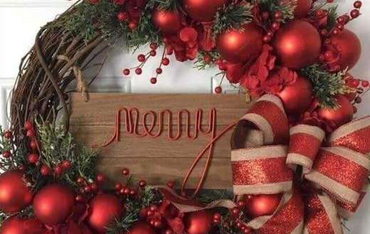 Christmas wreath made of branches red berries bow and ornaments online jigsaw puzzle.